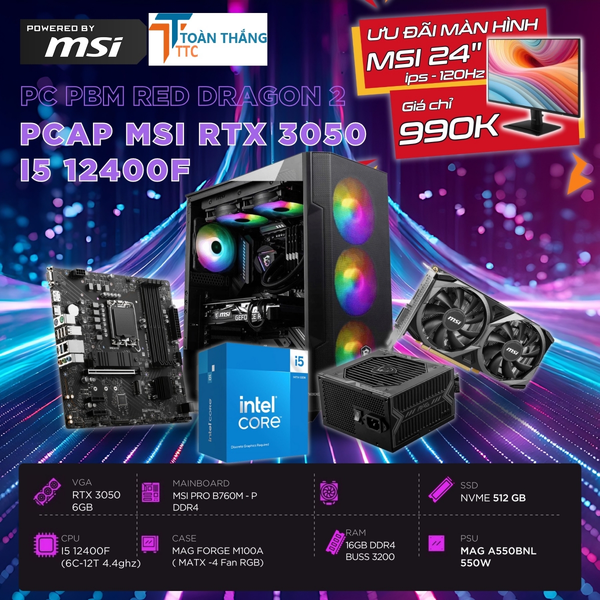 Toàn Thắng x MSI DRAGON PRO I5R16S500V3050O (i5 12400F/ Ram 16GB/ SSD 500 GB/ RTX3050 6GB OC) vừa sở hữu thiết kế đẹp mắt, cấu hình mạnh mẽ, đẳng cấp, đáp ứng đa dạng nhu cầu từ tác vụ văn phòng cơ bản đến chơi game cực chất.