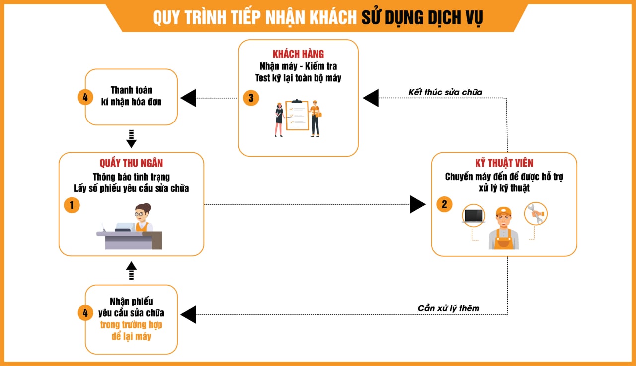 Bước 1: Nhân viên tiếp nhận yêu cầu sửa chữa tình trạng laptop/ máy tính của khách hàng